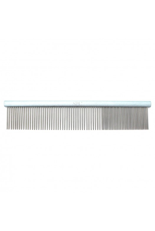 Гребінець SPL — професійний гребінь для шерсті тварин. Комбінований, 25 см ідеально підходить для собак із довгою шерстю й підшерстям. Рекомендується для загального використання та підняття волосся перед ножицями. Зроблена з високоякісного металу, завдяки чому довговічна та міцна. Гребінець має дві частоти зубів: приватну та рідкісну, тому добре й безболісно розчісує навіть супну шерсть.